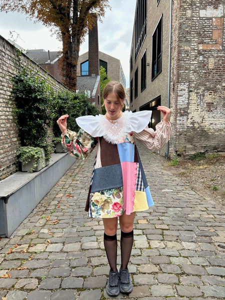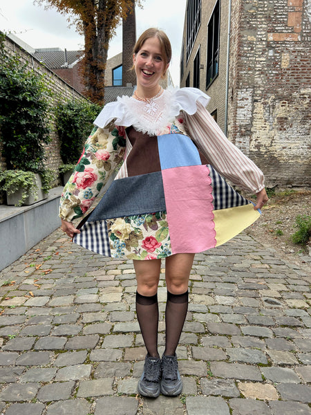 A-line patchwork dress with balloon sleeves with giant ruffles at the shoulder and a ruffle along the neckline. Closes with an invisible zipper at centre back. Made from mostly cotton scrap fabric. The tulle and ruffle are a cotton/poly blend.