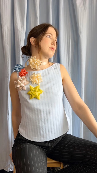 A fully lined boatneck, sleeveless top with bust darts and back body darts to add shape and a cluster of ribbon bows on the front. The hemline scoops down across front and back. Closes with an invisible zipper on centre back.